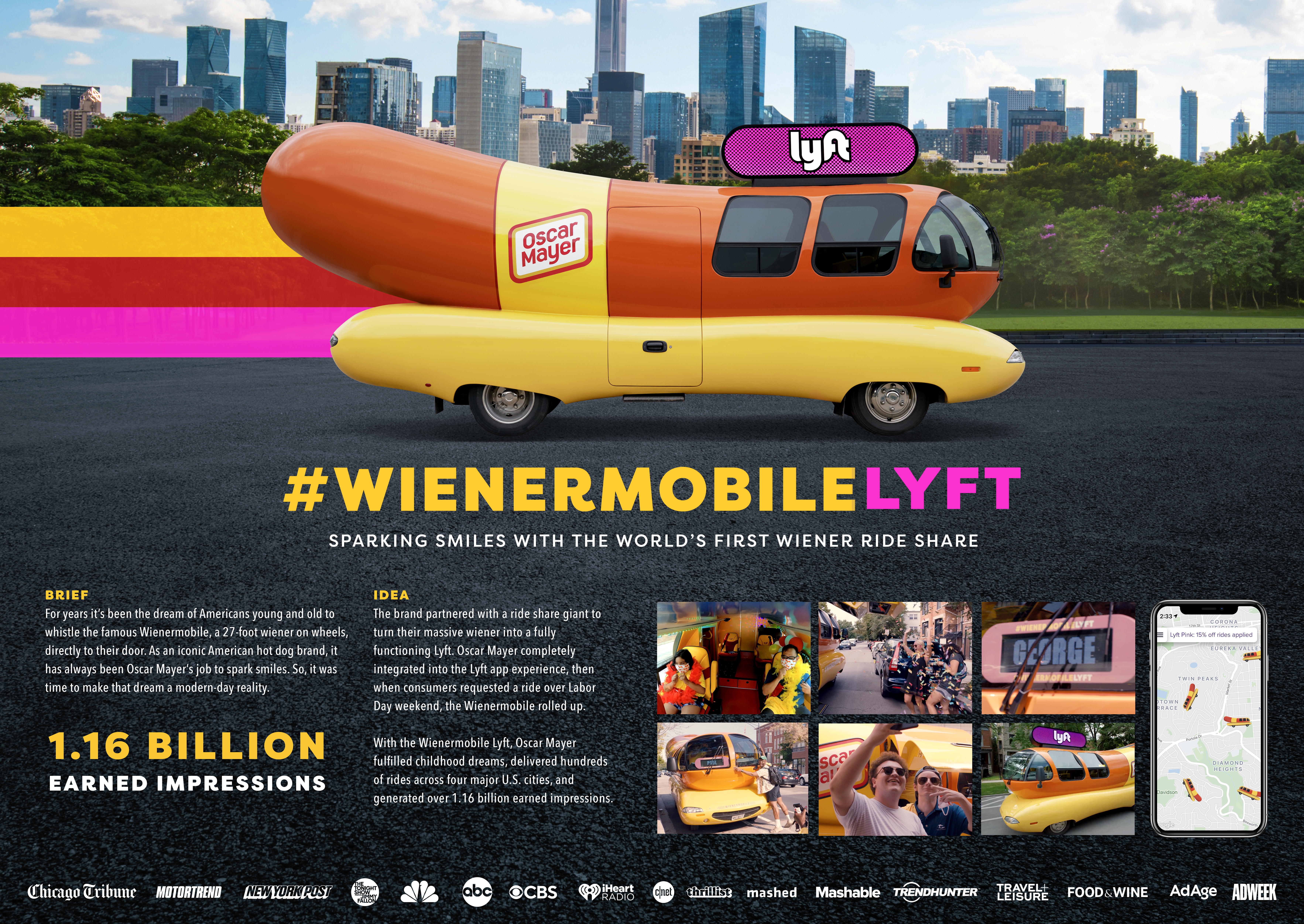With the Wienermobile Lyft, Oscar Mayer fulfilled childhood dreams, delivered hundreds of rides across four major U.S. cities, and generated over 1.16 billion earned impressions.